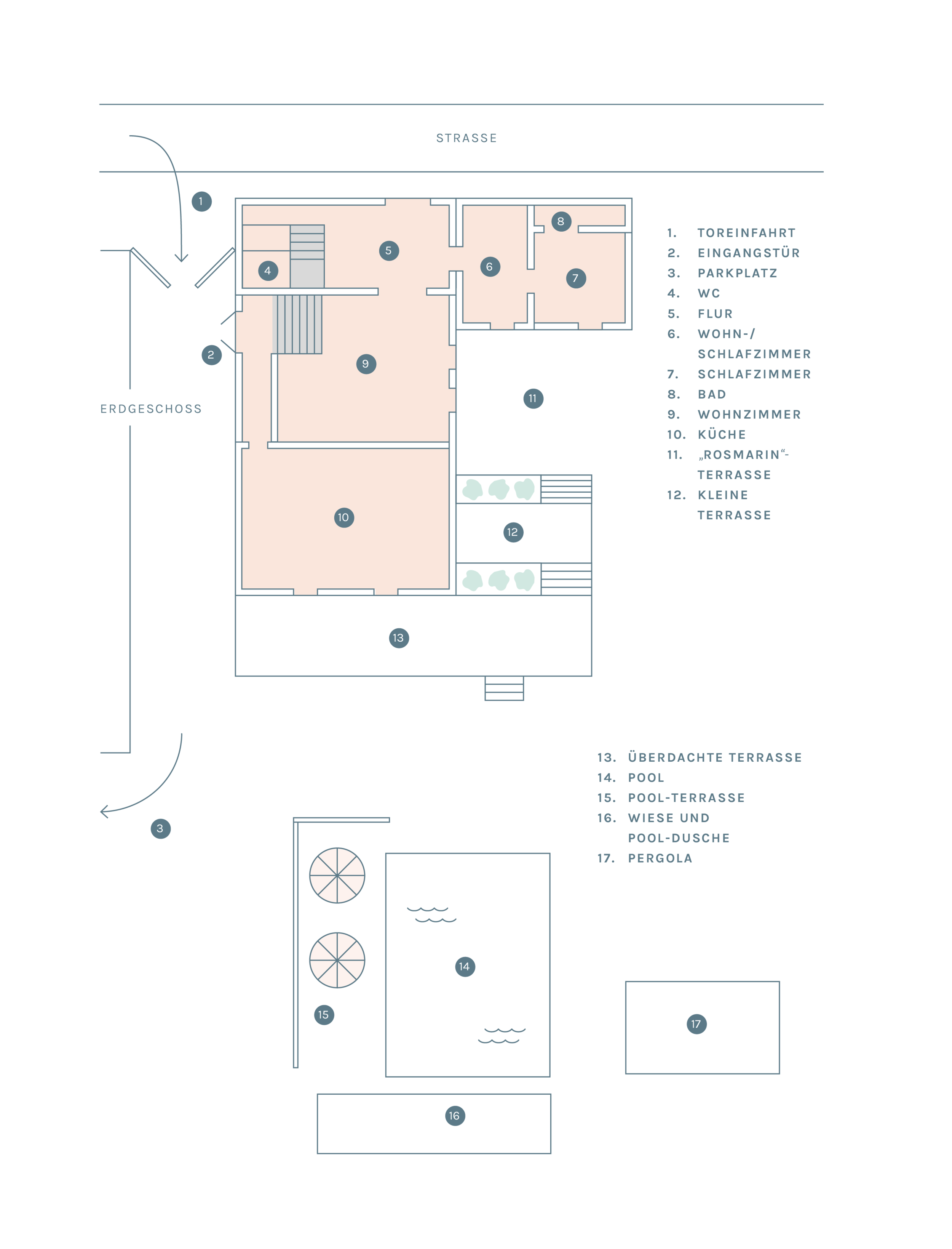 Der Wohnbereich wird durch das Farbkonzept der Farbdesignerin Friederike Tebbe und einer Kombination aus moderner Kunst und traditionellen Elementen geprägt und besteht aus zwei Wohnzimmern, einer Eingangshalle, Küche, Wirtschaftsraum und einem Gäste-WC.
