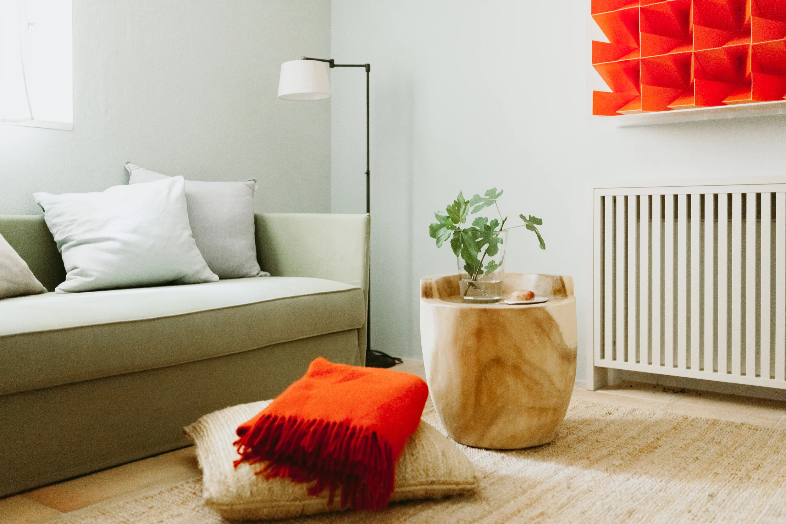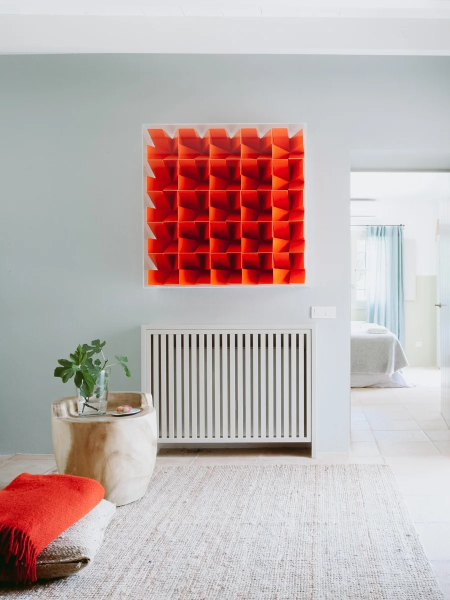 Das kräftige Orange der Arbeit von Peter Koch ist der Blickfang des Wohn-/Schlafzimmers, das ebenfalls Zugang zur großen Terrasse hat.